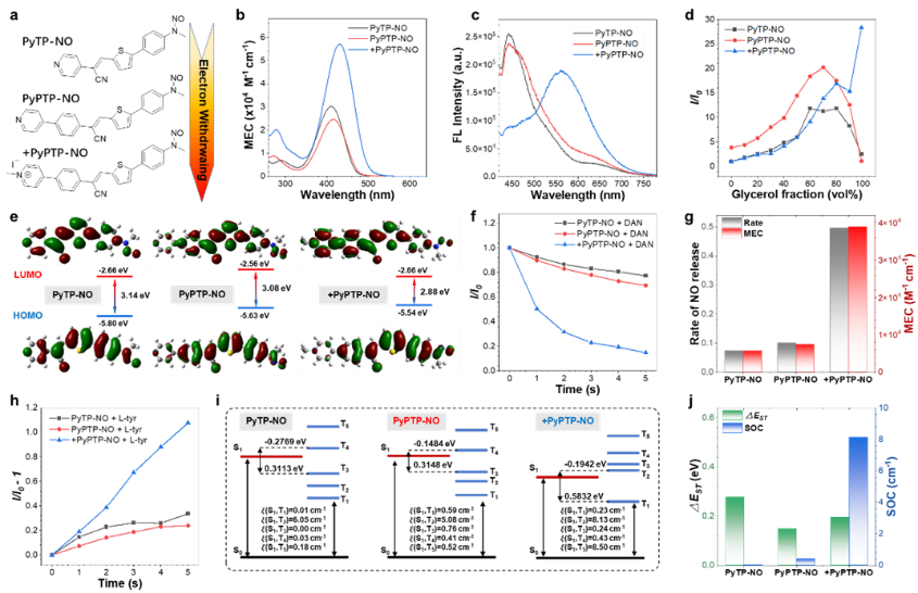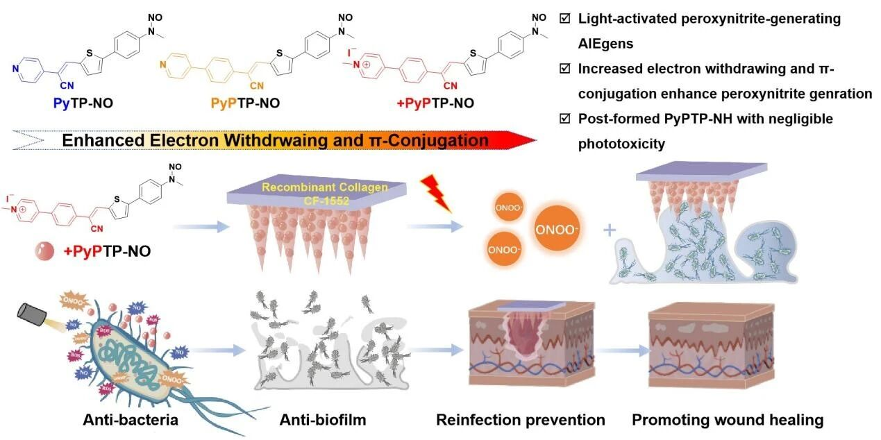 研究团队合成了一系列具有AIE特性的ONOO⁻生成分子:包括PyTP-NO、PyPTP-NO与+PyPTP-NO。这些分子以N-甲基-N-亚硝基苯胺作为光激活NO释放单元,噻吩作为π桥,苯基乙腈作为电子受体。通过增强分子吸电子能力与扩展π共轭体系,有效提升了分子消光系数和系间窜越效率。在这些ONOO⁻生成型AIE材料中,+PyPTP-NO表现出最强的自旋轨道耦合效应和光照射下最快的NO释放速率,从而能够同步促进O₂•⁻生成与NO释放,显著提升ONOO⁻产率。通过将+PyPTP-NO负载于双层微针贴片(+PyPTP-NO@DMN)的速溶聚乙烯醇(PVA)针尖中,可实现对生物膜的有效物理穿透。微针背衬由ε-聚赖氨酸接枝重组胶原蛋白(CF-1552)、氧化葡聚糖(ODex)和PVA构成,其降解速率远慢于PVA针尖,作为水凝胶敷料促进伤口愈合。