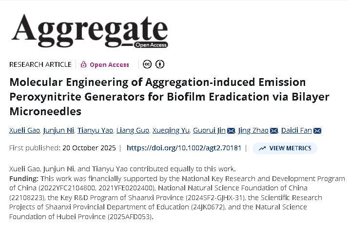 该成果以“Molecular Engineering of Aggregation-Induced Emission Peroxynitrite Generators for Biofilm Eradication via Bilayer Microneedles”为题发表于Aggregate期刊,论文第一作者为西北大学硕士研究生高雪丽和西安交通大学博士生倪钧钧,通讯作者为西北大学范代娣教授、赵婧副教授和西安交通大学靳国瑞教授。