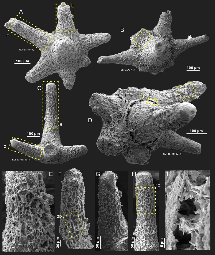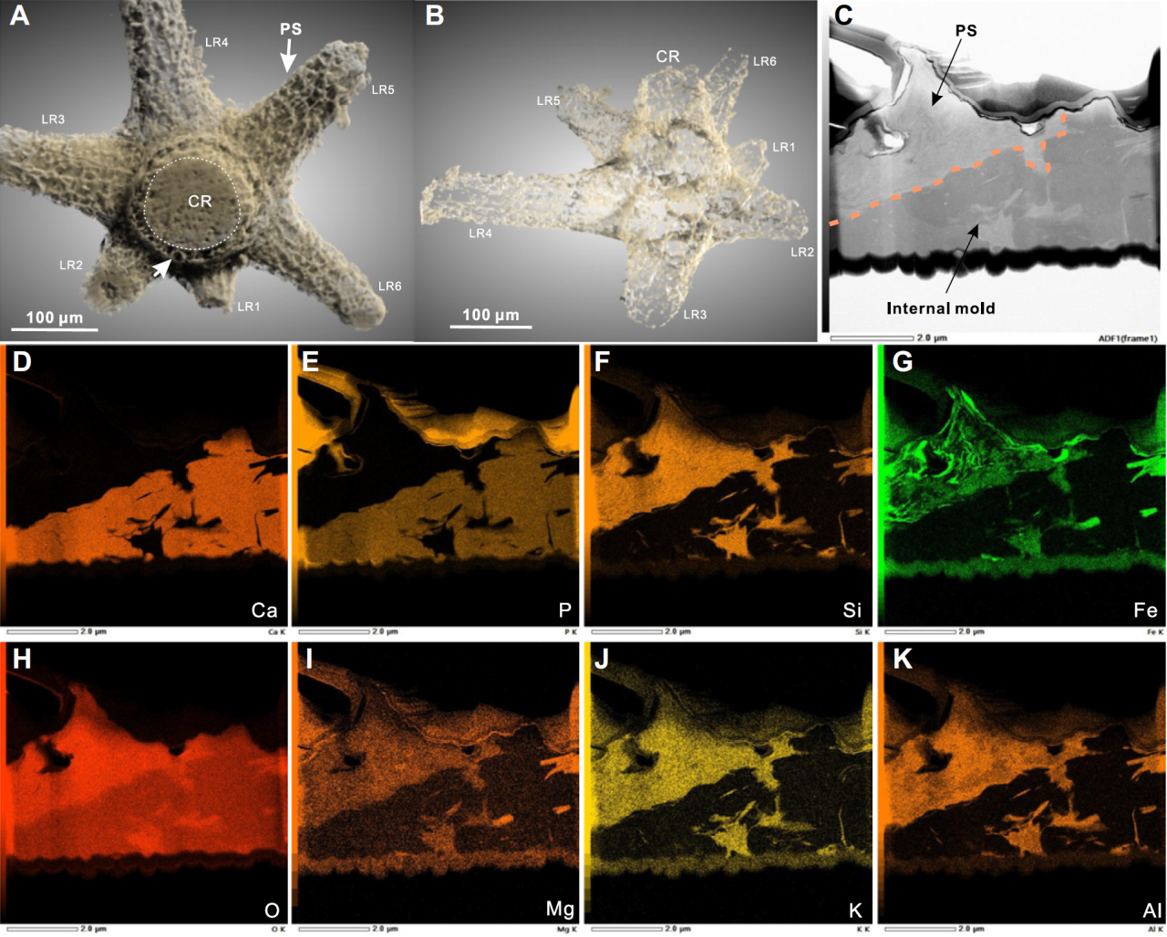 近日,西北大学张志飞教授指导博士研究生胡亚洲及团队成员,联合课题组外专Timothy Topper和Luke Strotz教授及中科院南古所李国祥研究员与潘兵博士,对产自我国华北板块寒武纪早期猴家山组的开腔骨骨片开展了系统研究。通过对大量大小仅为300μm化石骨片的扫描电镜、显微CT、聚焦离子束与扫描电镜联用及透射电子显微镜能谱分析(FIB-SEM, TEM-EDS),发现了开腔骨骨片上存在大量以黏土保存的多边形结构,这些结构包覆整个开腔骨骨片。通过和现生贝壳对比,这些多边形的网状结构与软体动物珠母贝棱柱层间的有机质框架在大小、形态和显微结构上存在着极大的相似性,据此认为开腔骨化石骨片上的多边形结构与软体动物的有机质框架结构在起源、分泌方式上类似,两者的形成受控于表皮细胞,都发育有细胞间的棱和柱状结构。其矿化骨骼与现代软体动物一样也形成于这些多边形有机框架中。结合软体动物有机质框架的形成过程及形成机制,研究认为,疑难动物化石开腔骨类内部的空腔是属于表皮细胞包围形成的真体腔,具有现代真后生动物以表皮细胞形成表皮组织,进而控制外部骨骼矿化的能力。
