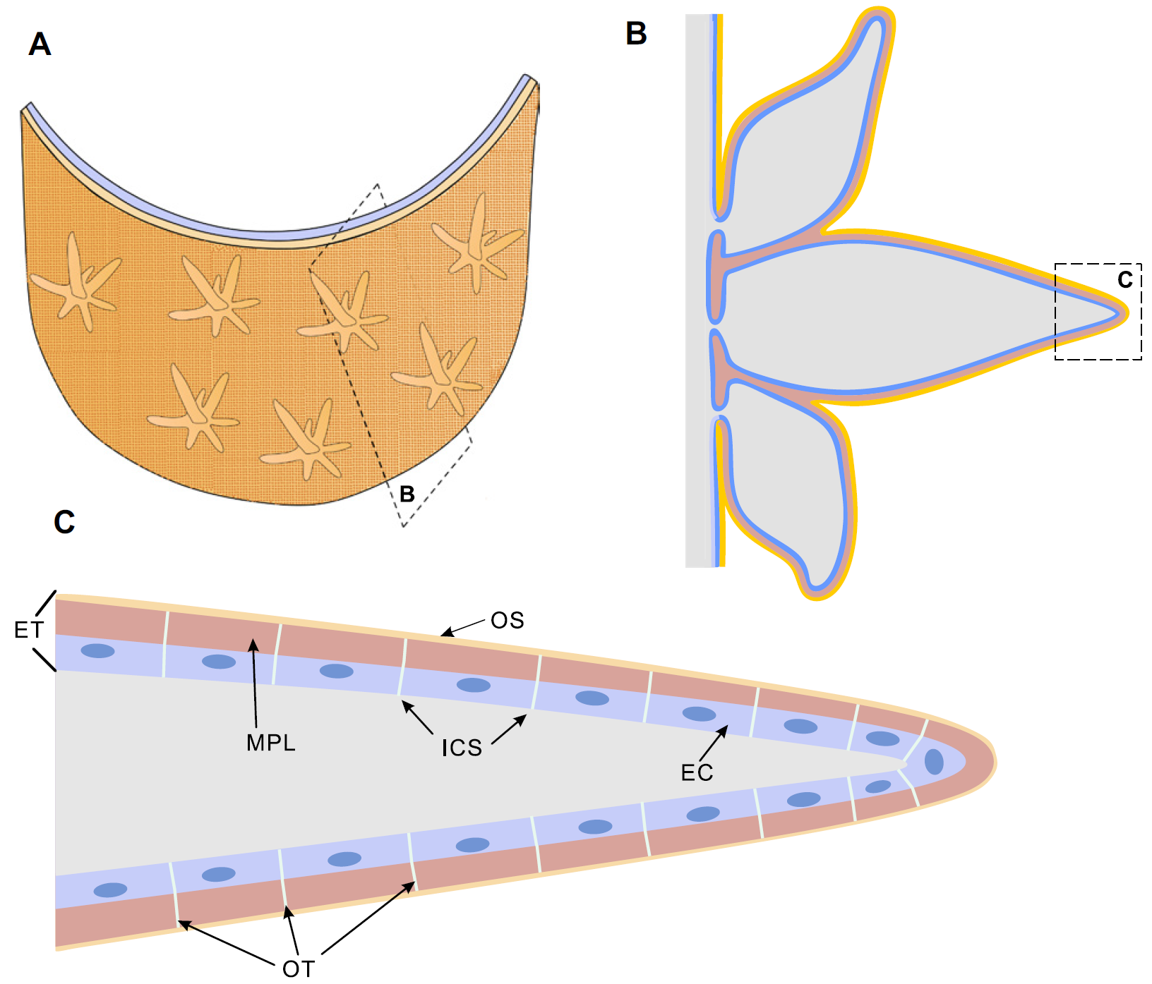 ET=上皮组织,MPL=多边形矿化层,OS-=外部有机质层,OT=有机制框架,EC=表皮细胞