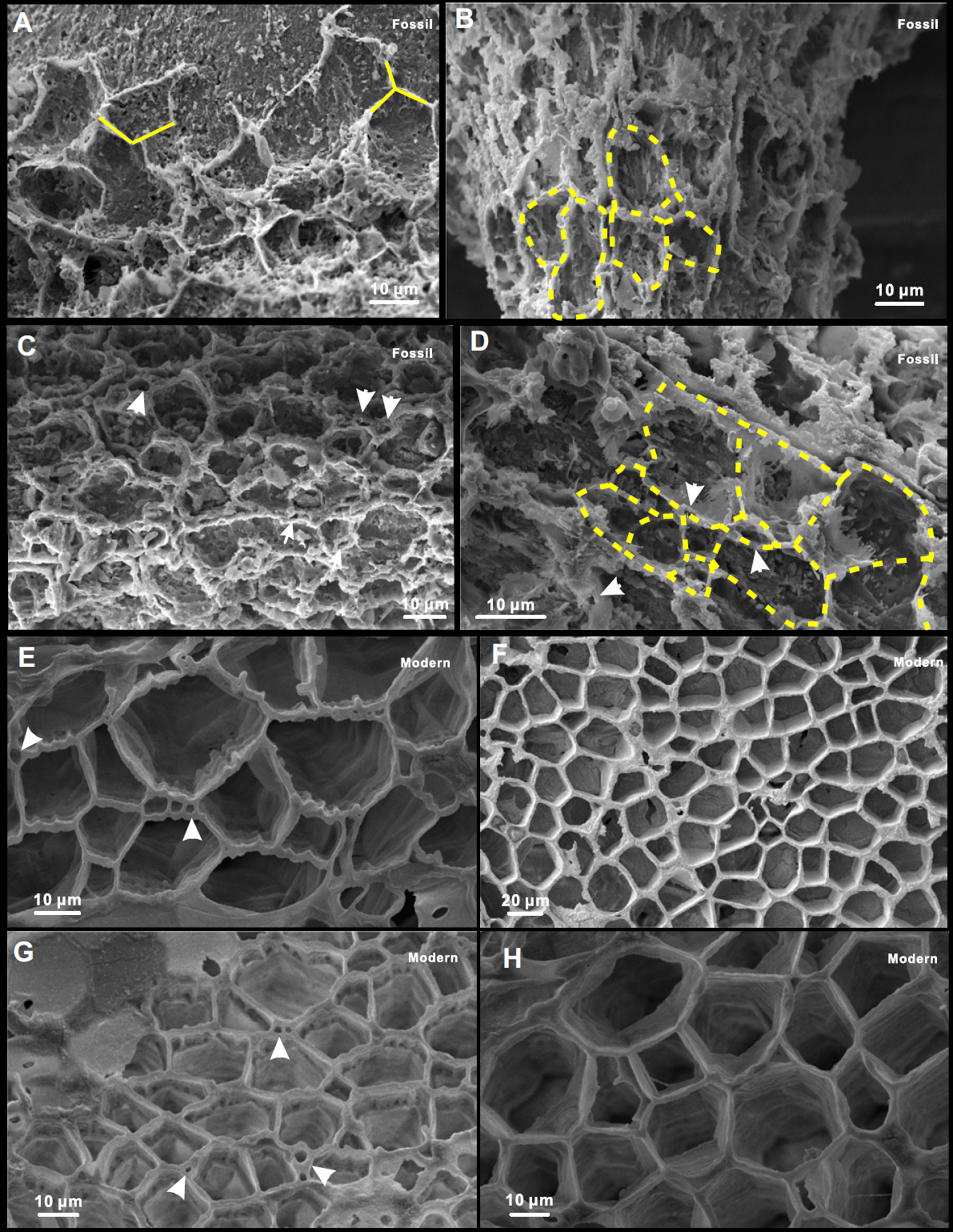 寒武系第四阶猴家山组开腔骨骨片上保存多边形有机质框架结构(A-D)与软体动物棱柱层的多边形结构(E-H),在大小与形状上均有极大的相似性