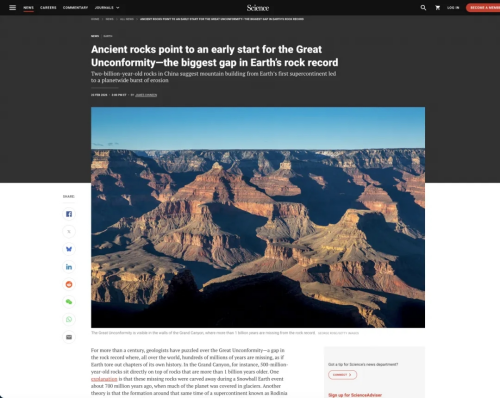 该研究成果引起多家科学媒体的关注,《科学》(Science)期刊新闻专栏记者James Dinneen第一时间采访了我校段亮、张兴亮教授,相关内容以“岩石记录显示大不整合的形成时间比预想的更早(Ancient rocks point to an early start for the Great Unconformity—the biggest gap in Earth’s rock record)”为题在《科学》期刊的研究新闻栏目报道。