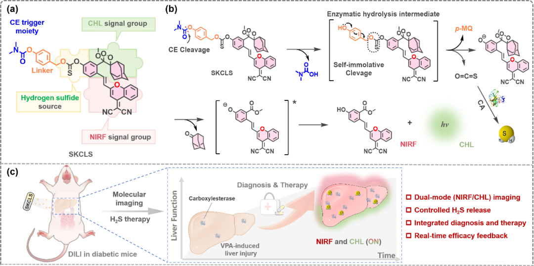 尽管光学成像在DILI研究中潜力巨大,但诊疗一体化平台仍显匮乏。H₂S作为新兴气体信号分子,能通过修饰Keap1激活Nrf2通路,发挥显著抗炎抗氧化及护肝作用。基于此,研究团队创新设计了SKCLS探针。该探针由三部分构成:高效的NIRF/CHL双模发射团、基于硫酯的H₂S释放单元以及CE特异性触发基团N,N-二甲氨基甲酰基。在肝脏高表达的羧酸酯酶作用下,SKCLS发生水解反应,同步释放近红外荧光信号、化学发光信号以及羰基硫(COS),后者在碳酸酐酶催化下迅速转化为具有细胞保护作用的H₂S