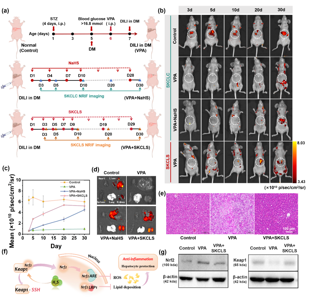 近日,我校郭媛教授/张健健教授团队在糖尿病并发药物性肝损伤(DILI)的诊疗一体化研究中取得重要进展。该团队成功构建了一种羧酸酯酶(CE)激活型硫化氢(HS)供体(SKCLS)分子药物策略,该策略同时集成了近红外荧光(NIRF)与化学发光(CHL)双模态成像功能,可实现对糖尿病小鼠模型中DILI进程的精准可视化监测与有效治疗,为临床解决糖尿病用药所致肝毒性问题提供了新的方案。