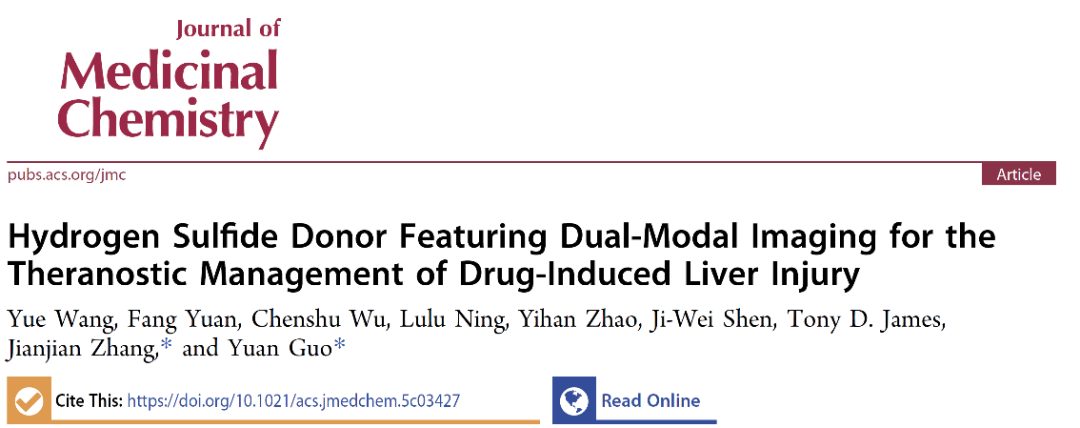 该成果以 “Hydrogen Sulfide Donor Featuring Dual-Modal Imaging for the Theranostic Management of Drug-Induced Liver Injury” 为题,发表于国际药学期刊Journal of Medicinal Chemistry。我校硕士研究生王悦为论文第一作者,郭媛教授和张健健教授为共同通讯作者。该研究率先开发出用于糖尿病DILI诊疗的双模态成像HS药物供体,为肝损伤的精准诊疗提供了酶激活-双模成像-气体治疗的研究范式。该工作得到了国家自然科学基金项目 (22277098, 22477101, 22037002)、陕西省基础科学(化学、生物学)研究院项目 (22JHQ070) 及教育部心肌缺血重点实验室项目 (KF202311) 等支持。