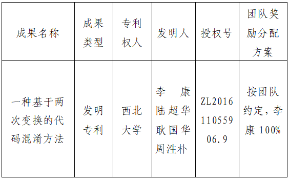 按照《西北大学促进科技成果转化实施办法》(西大科〔2019〕5号)相关规定,拟对我校计算机学院李康教授作为成果负责人的1项发明专利权实施转化,现将相关信息公示如下: