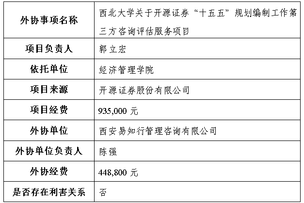 当前位置: 网站首页 > 通知公告 > 正文 开源证券“十五五”规划编制工作第三方咨询评估服务项目外协公示 浏览量:时间:2025-10-31 经项目负责人申请、所在单位审核,现将开源证券“十五五”规划编制工作第三方咨询评估服务项目的外协事项公示如下: 公示期:2025年10月31日至2025年11月4日止,共5天。 若对上述外协事项存有异议,请在公示期内向科学技术处以书面形式反映,我们将严格保密,逾期不予受理。 办公电话:029-88302249 传真号码:029-88308972 电子邮箱:cxy@nwu.edu.cn 联系地址:陕西省西安市长安区郭杜教育科技产业区学府大街1号(邮编:710127) 科学技术处 2025年10月31日