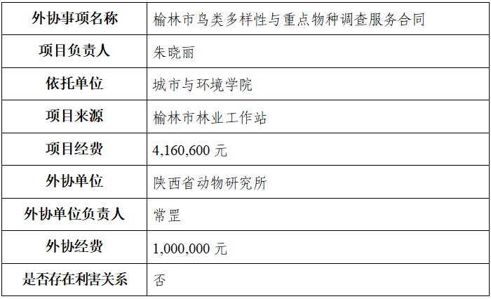当前位置: 网站首页 > 通知公告 > 正文 榆林市鸟类资源调查与保护研究服务项目外协公示 浏览量:时间:2026-01-21 经项目负责人申请、所在单位审核,现将榆林市鸟类资源调查与保护研究服务项目的外协事项公示如下: 公示期:2026年1月21日至2026年1月25日止,共5天。 若对上述外协事项存有异议,请在公示期内向科学技术处以书面形式反映,我们将严格保密,逾期不予受理。 办公电话:029-88302249 传真号码:029-88308972 电子邮箱:cxy@nwu.edu.cn 联系地址:陕西省西安市长安区郭杜教育科技产业区学府大街1号(邮编:710127) 科学技术处(高技术转移创新研究院) 2026年1月21日