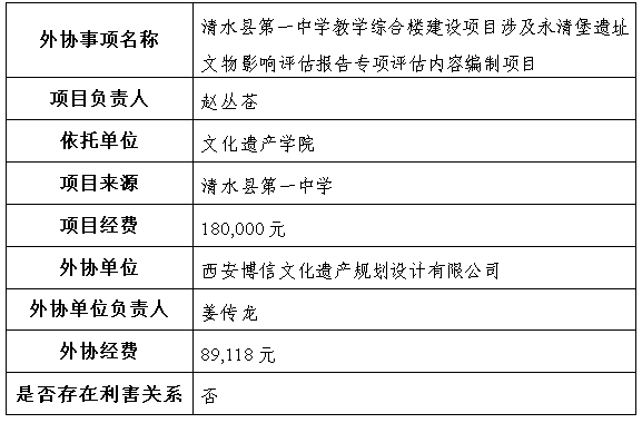经项目负责人申请、所在单位审核,现将清水县第一中学教学综合楼建设项目涉及永清堡遗址文物影响评估项目的外协事项公示如下: