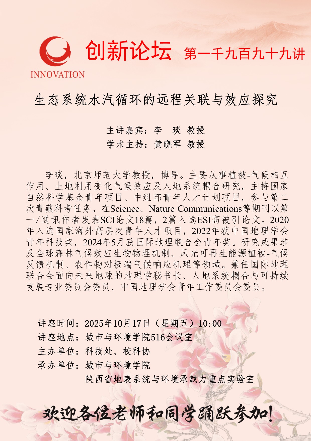 西北大学创新论坛第一千九百九十九讲:生态系统水汽循环的远程关联与效应探究