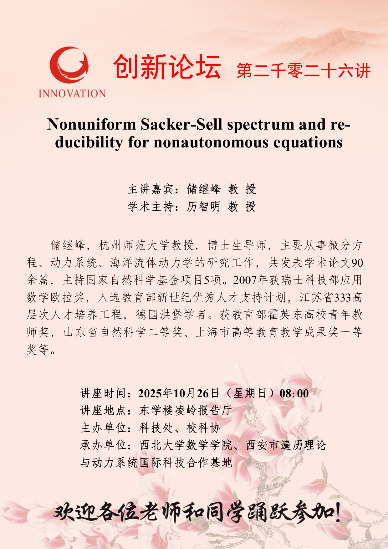 当前位置: 网站首页 > 讲座预告 > 正文 西北大学创新论坛第二千零二十六讲:Nonuniform Sacker-Sell spectrum and reducibility for nonautonomous equations 浏览量:时间:2025-10-23