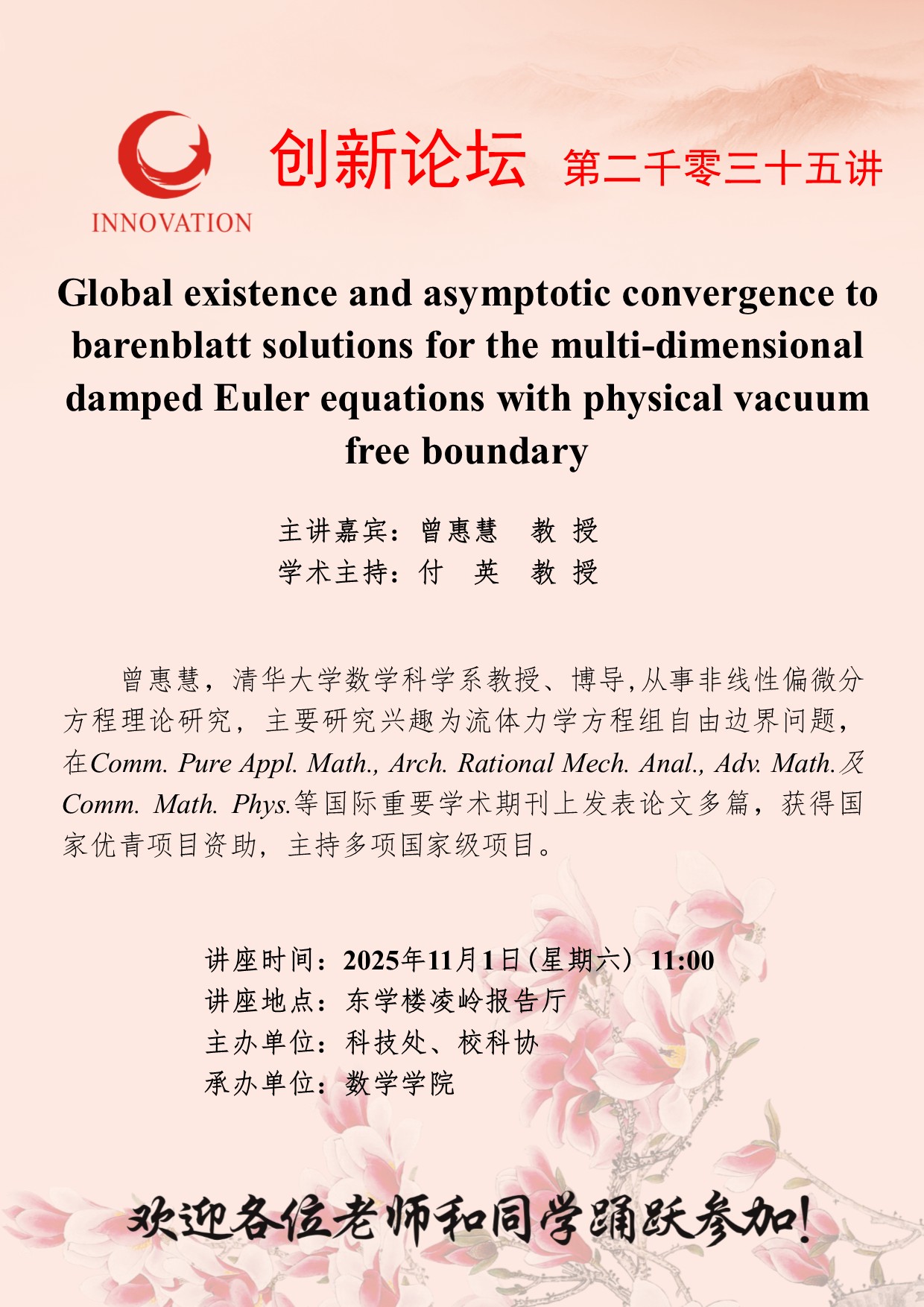 当前位置: 网站首页 > 讲座预告 > 正文 西北大学创新论坛第二千零三十五讲:Global existence and asymptotic convergence to barenblatt solutions for the multi-dimensional damped Euler equations with physical vacuum free boundary 浏览量:时间:2025-10-30