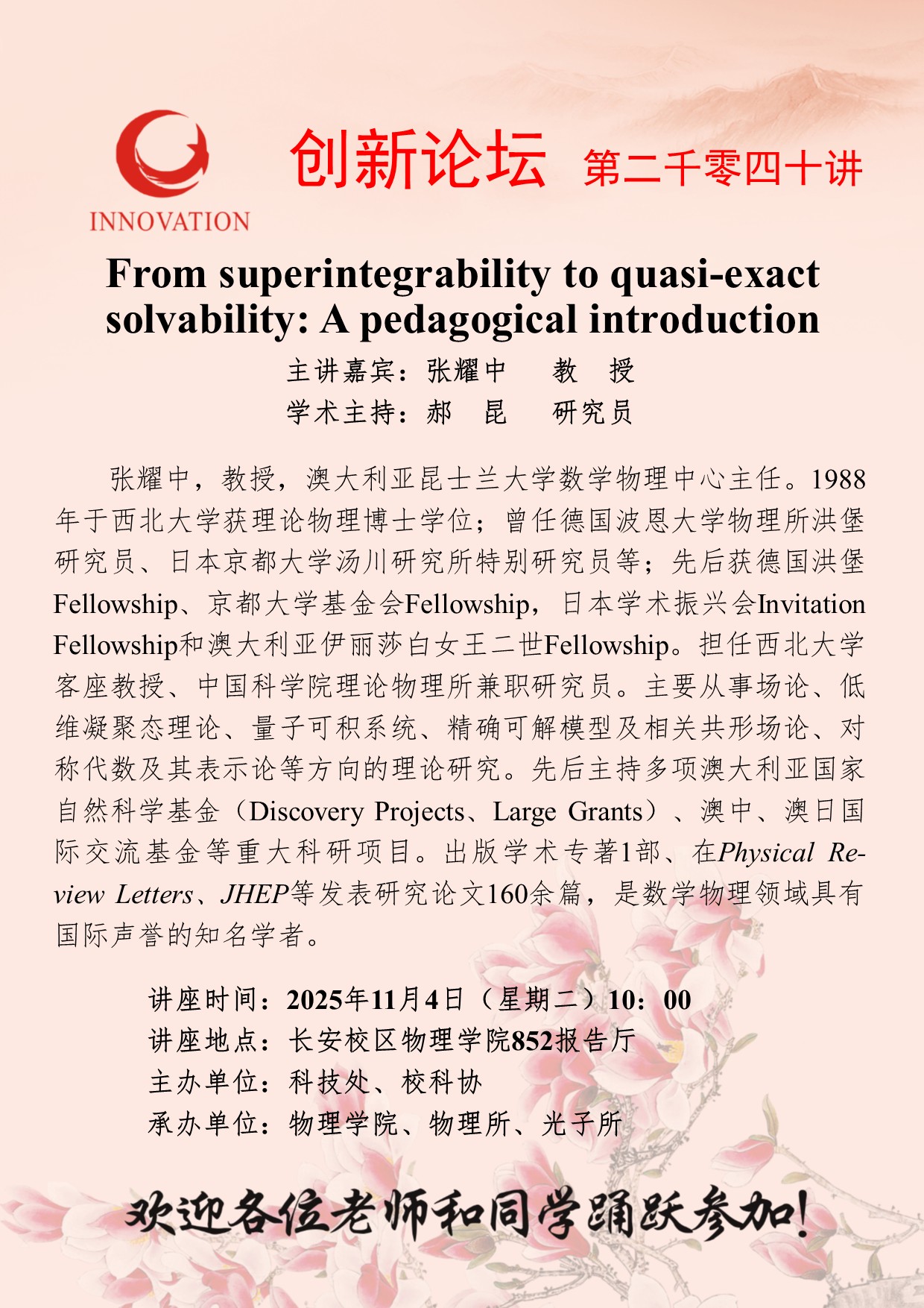 当前位置: 网站首页 > 讲座预告 > 正文 西北大学创新论坛第二千零四十讲:From superintegrability to quasi-exact solvability: A pedagogical introduction 浏览量:时间:2025-11-03