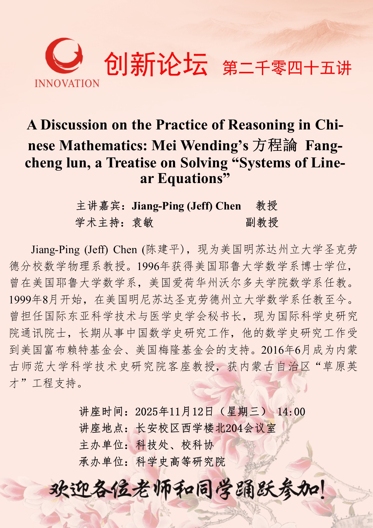 当前位置: 网站首页 > 讲座预告 > 正文 西北大学创新论坛第二千零四十五讲:A Discussion on the Practice of Reasoning in Chinese Mathematics: Mei Wending’s 方程論 Fangcheng lun, a Treatise on Solving “Systems of Linear Equations” 浏览量:时间:2025-11-06