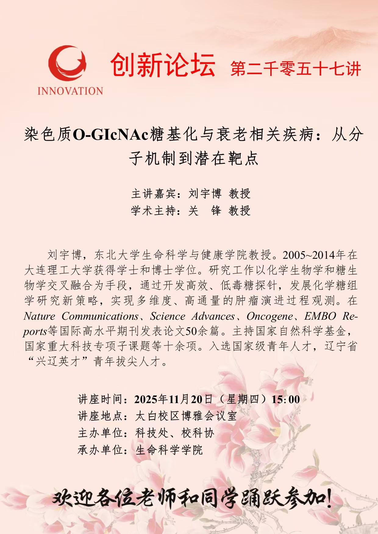 西北大学创新论坛第二千零五十七讲:染色质O-GIcNAc糖基化与衰老相关疾病:从分子机制到潜在靶点