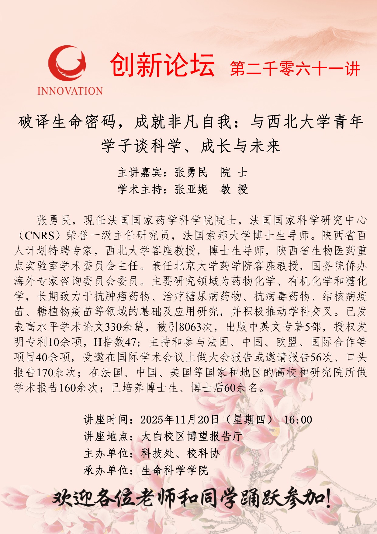 西北大学创新论坛第二千零六十一讲:破译生命密码,成就非凡自我:与西北大学青年学子谈科学、成长与未来