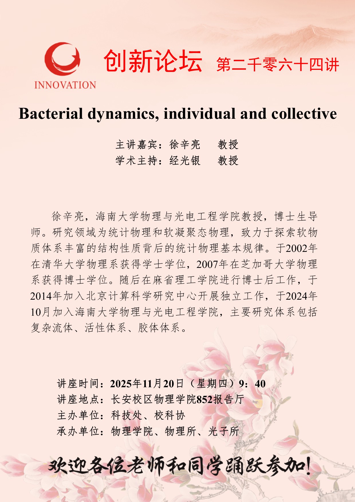当前位置: 网站首页 > 讲座预告 > 正文 西北大学创新论坛第二千零六十四讲:Bacterial dynamics, individual and collective 浏览量:时间:2025-11-19