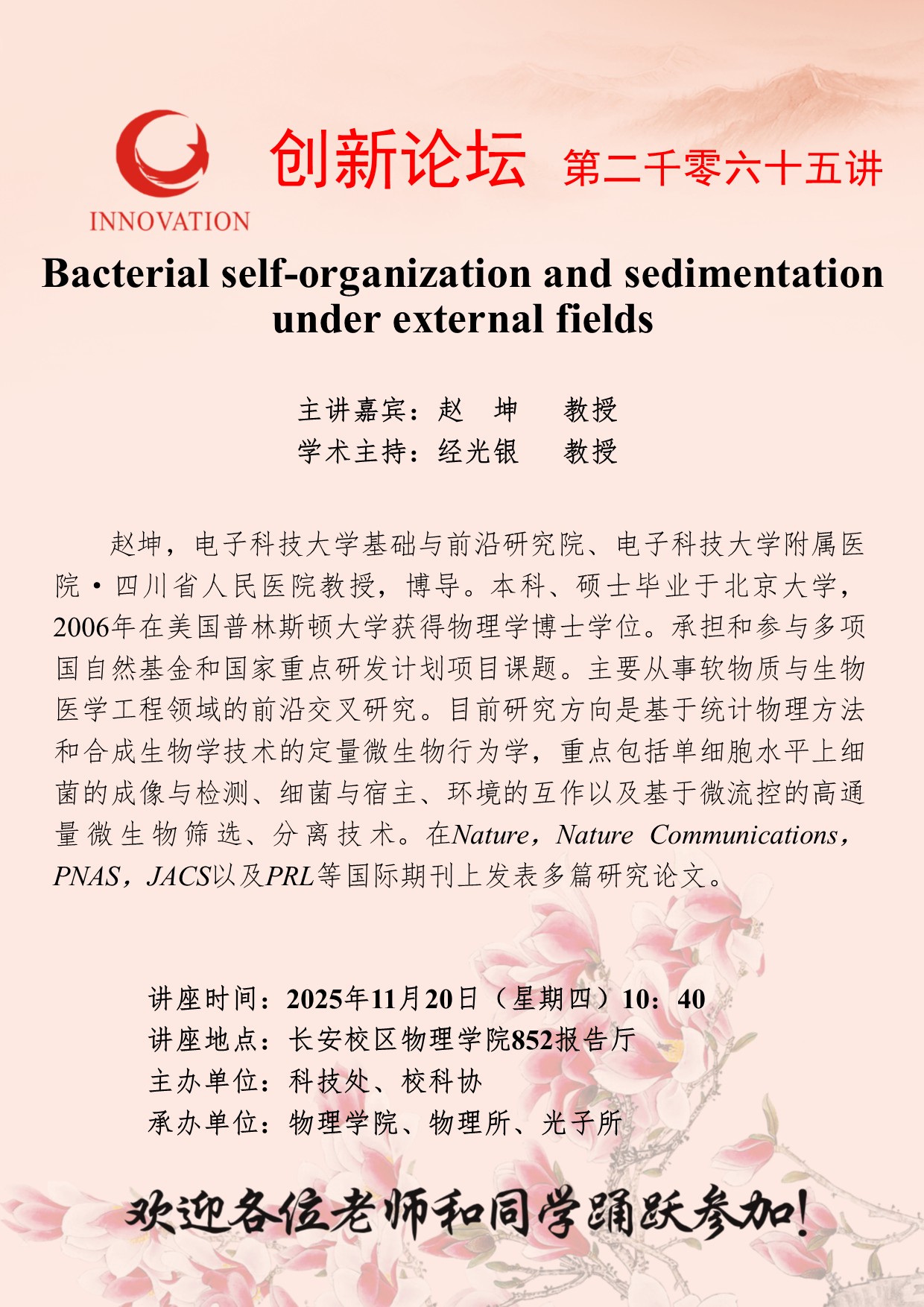 当前位置: 网站首页 > 讲座预告 > 正文 西北大学创新论坛第二千零六十五讲:Bacterial self-organization and sedimentation under external fields 浏览量:时间:2025-11-19
