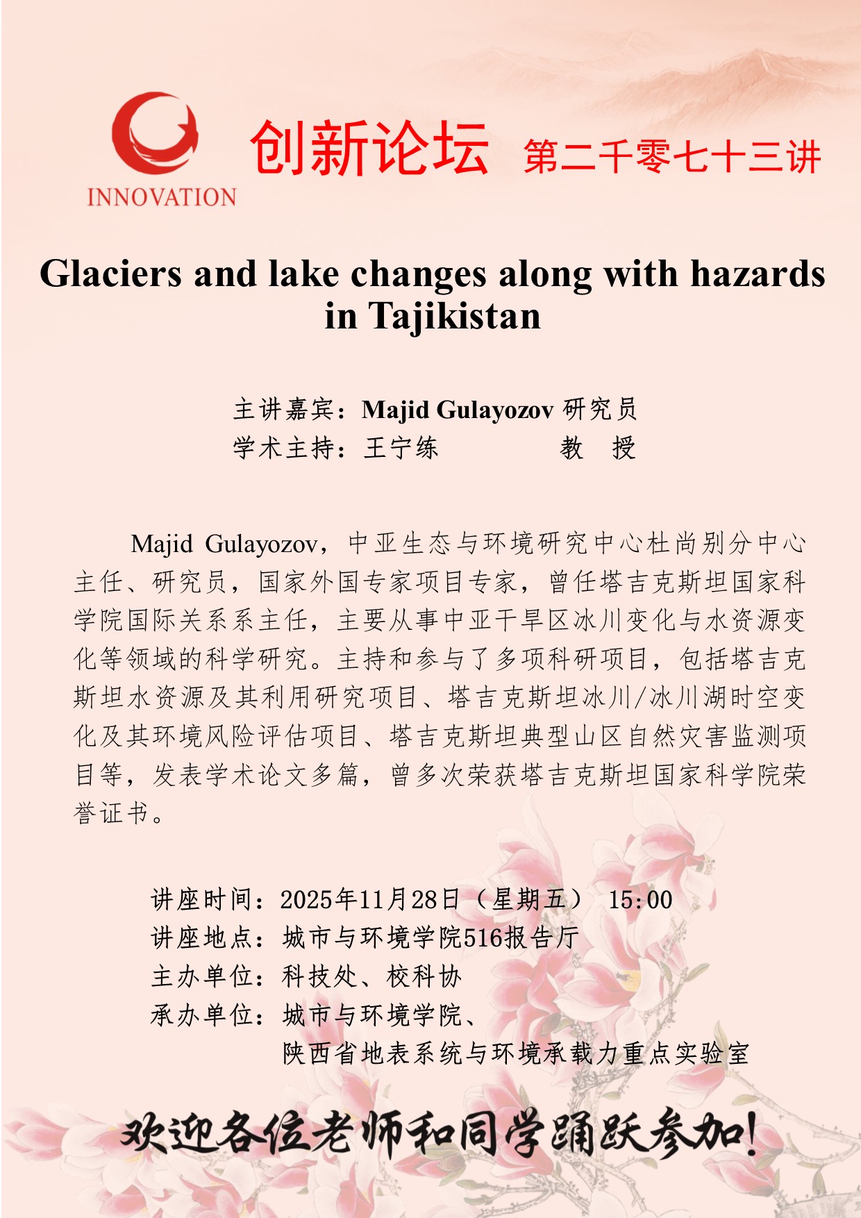 当前位置: 网站首页 > 讲座预告 > 正文 西北大学创新论坛第二千零七十三讲:Glaciers and lake changes along with hazards in Tajikistan 浏览量:时间:2025-11-27