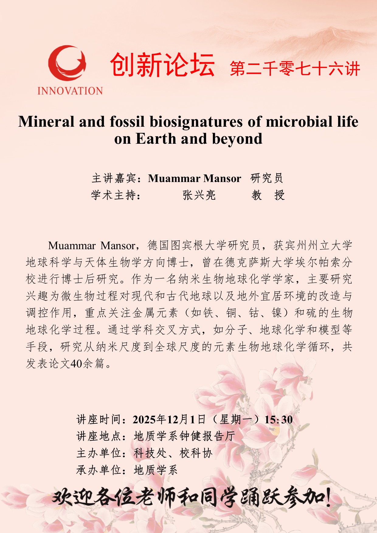 当前位置: 网站首页 > 讲座预告 > 正文 西北大学创新论坛第二千零七十六讲:Mineral and fossil biosignatures of microbial life on Earth and beyond 浏览量:时间:2025-11-27