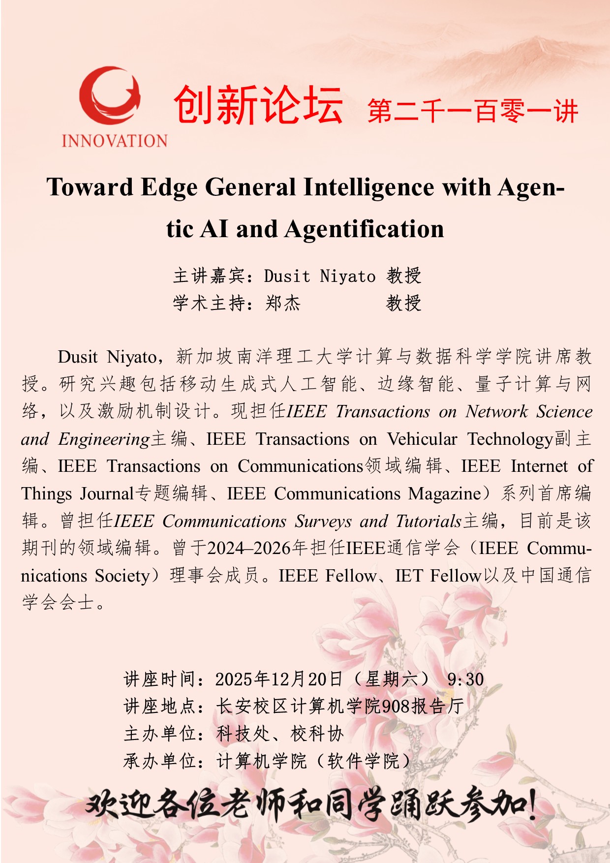 当前位置: 网站首页 > 讲座预告 > 正文 西北大学创新论坛第两千一百零一讲:Toward Edge General Intelligence with Agentic AI and Agentification 浏览量:时间:2025-12-17