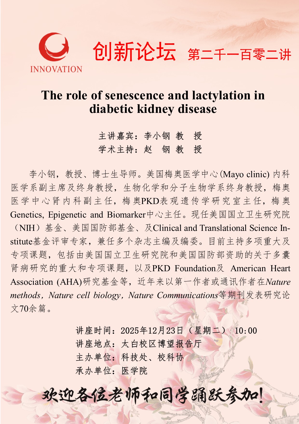 当前位置: 网站首页 > 讲座预告 > 正文 西北大学创新论坛第两千一百零二讲:The role of senescence and lactylation in diabetic kidney disease 浏览量:时间:2025-12-22