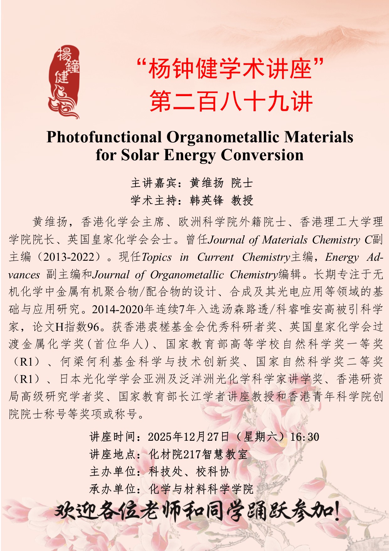 当前位置: 网站首页 > 讲座预告 > 正文 “杨钟健学术讲座”第二百八十九讲:Photofunctional Organometallic Materials for Solar Energy Conversion 浏览量:时间:2025-12-25