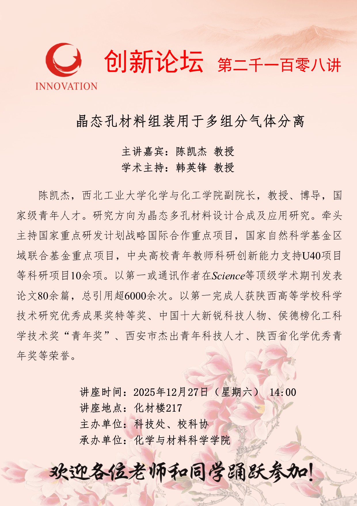西北大学创新论坛第二千一百零八讲:晶态孔材料组装用于多组分气体分离