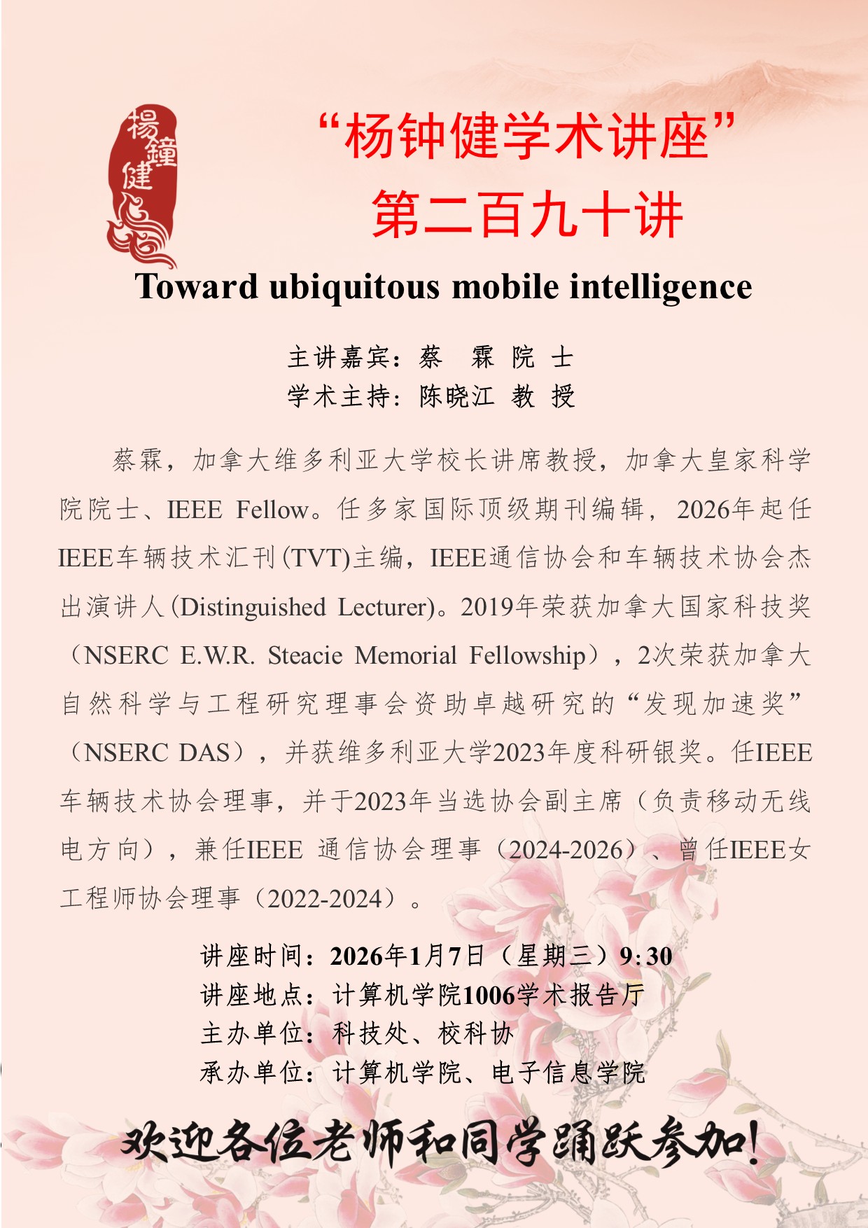 “杨钟健学术讲座”第二百九十讲:Toward ubiquitous mobile intelligence