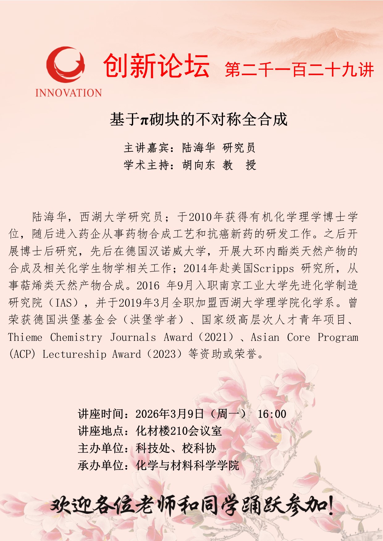 西北大学创新论坛第二千一百二十九讲:基于π砌块的不对称全合成