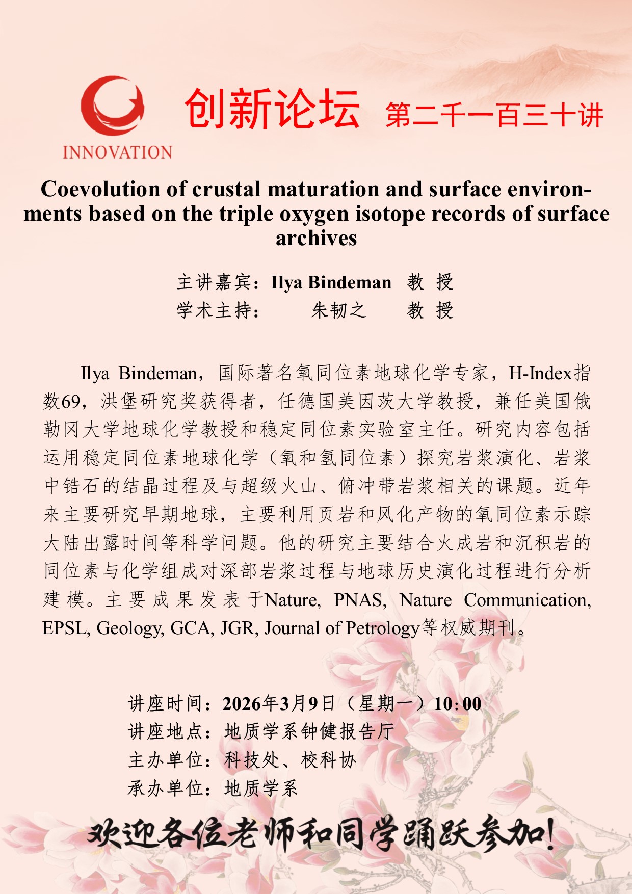 当前位置: 网站首页 > 讲座预告 > 正文 西北大学创新论坛第两千一百三十讲:Coevolution of crustal maturation and surface environ-ments based on the triple oxygen isotope records of surface archives 浏览量:时间:2026-03-06