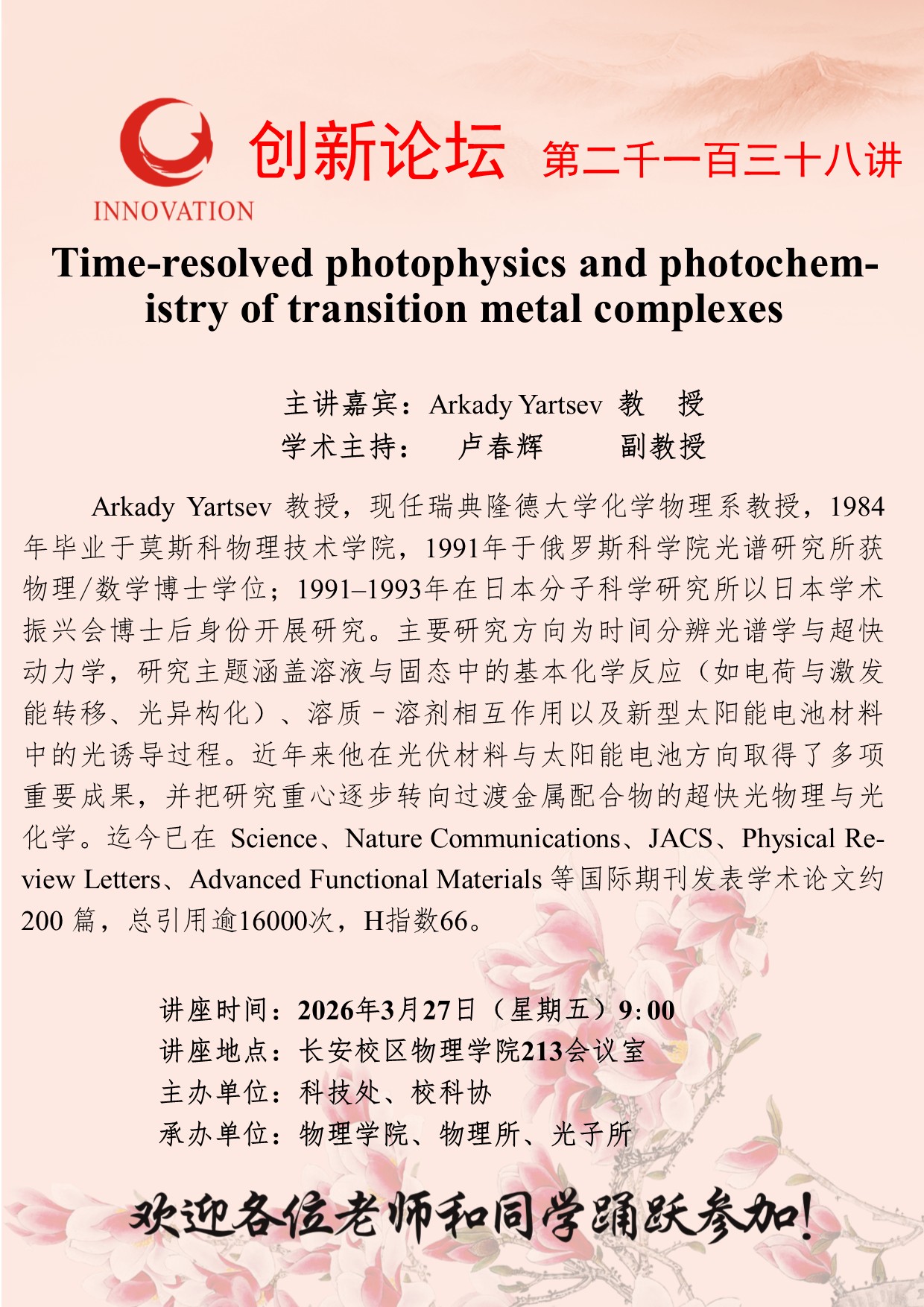 当前位置: 网站首页 > 讲座预告 > 正文 西北大学创新论坛第二千一百三十八讲:Time-resolved photophysics and photochemistry of transition metal complexes 浏览量:时间:2026-03-25