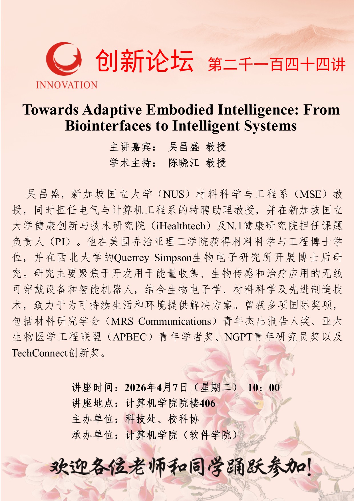 当前位置: 网站首页 > 讲座预告 > 正文 西北大学创新论坛第二千一百四十四讲:Towards Adaptive Embodied Intelligence: From Biointerfaces to Intelligent Systems 浏览量:时间:2026-04-03