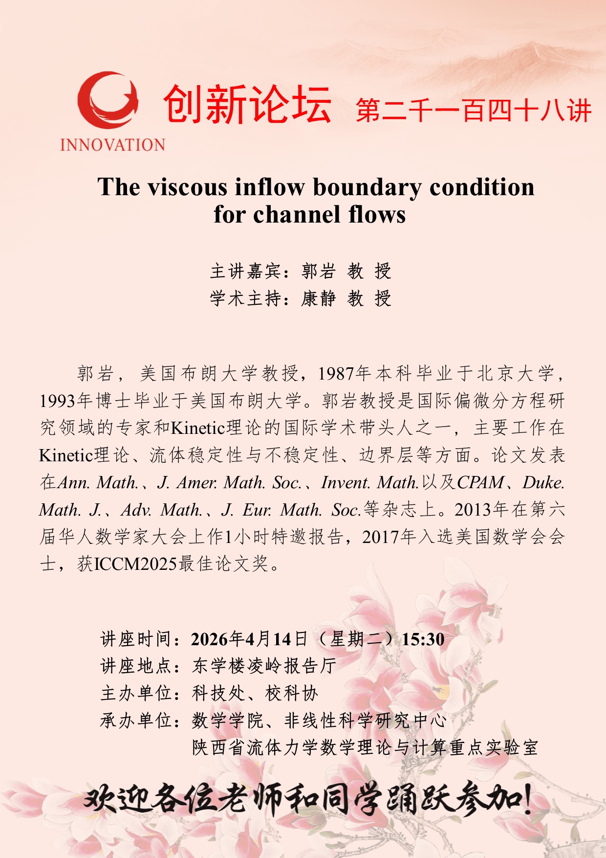 当前位置: 网站首页 > 讲座预告 > 正文 西北大学创新论坛第二千一百四十八讲:The viscous inflow boundary condition for channel flows 浏览量:时间:2026-04-10