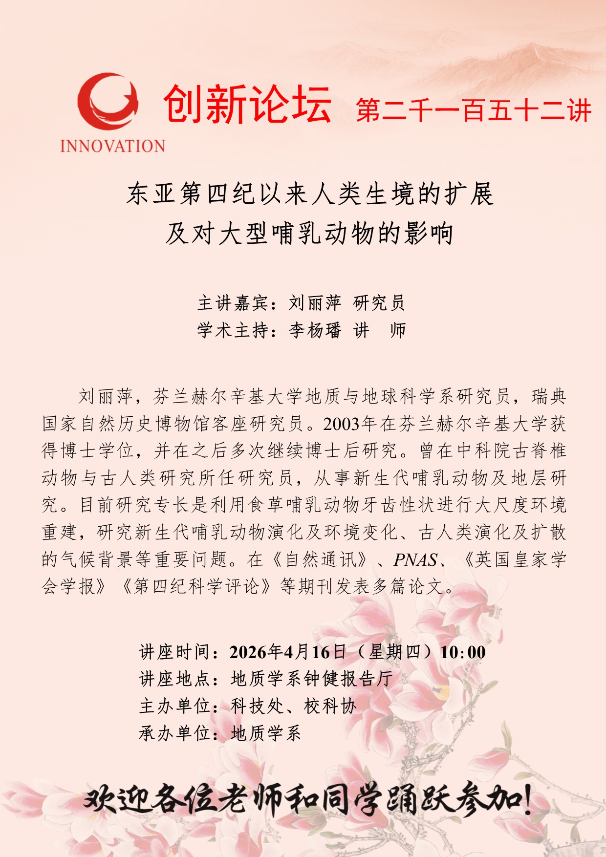 西北大学创新论坛第二千一百五十二讲:东亚第四纪以来人类生境的扩展及对大型哺乳动物的影响