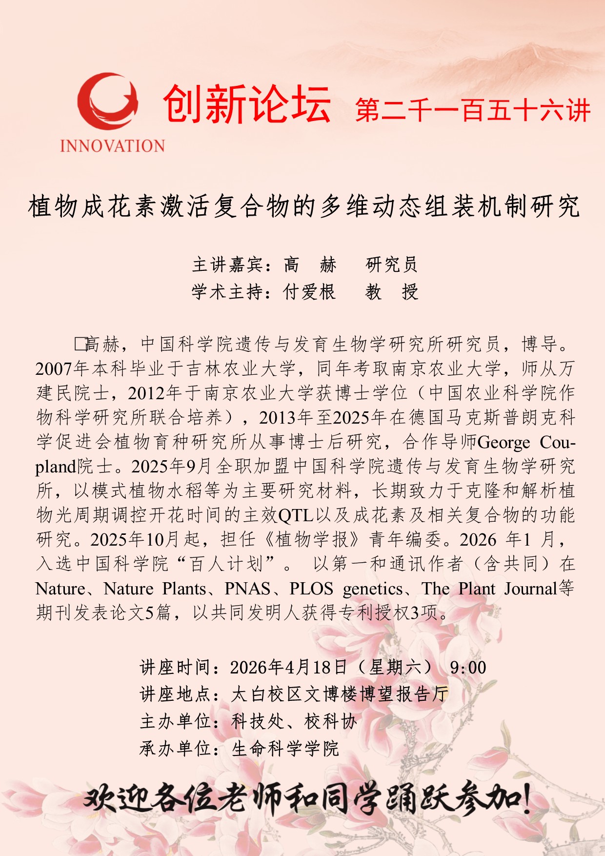 西北大学创新论坛第二千一百五十六讲:植物成花素激活复合物的多维动态组装机制研究