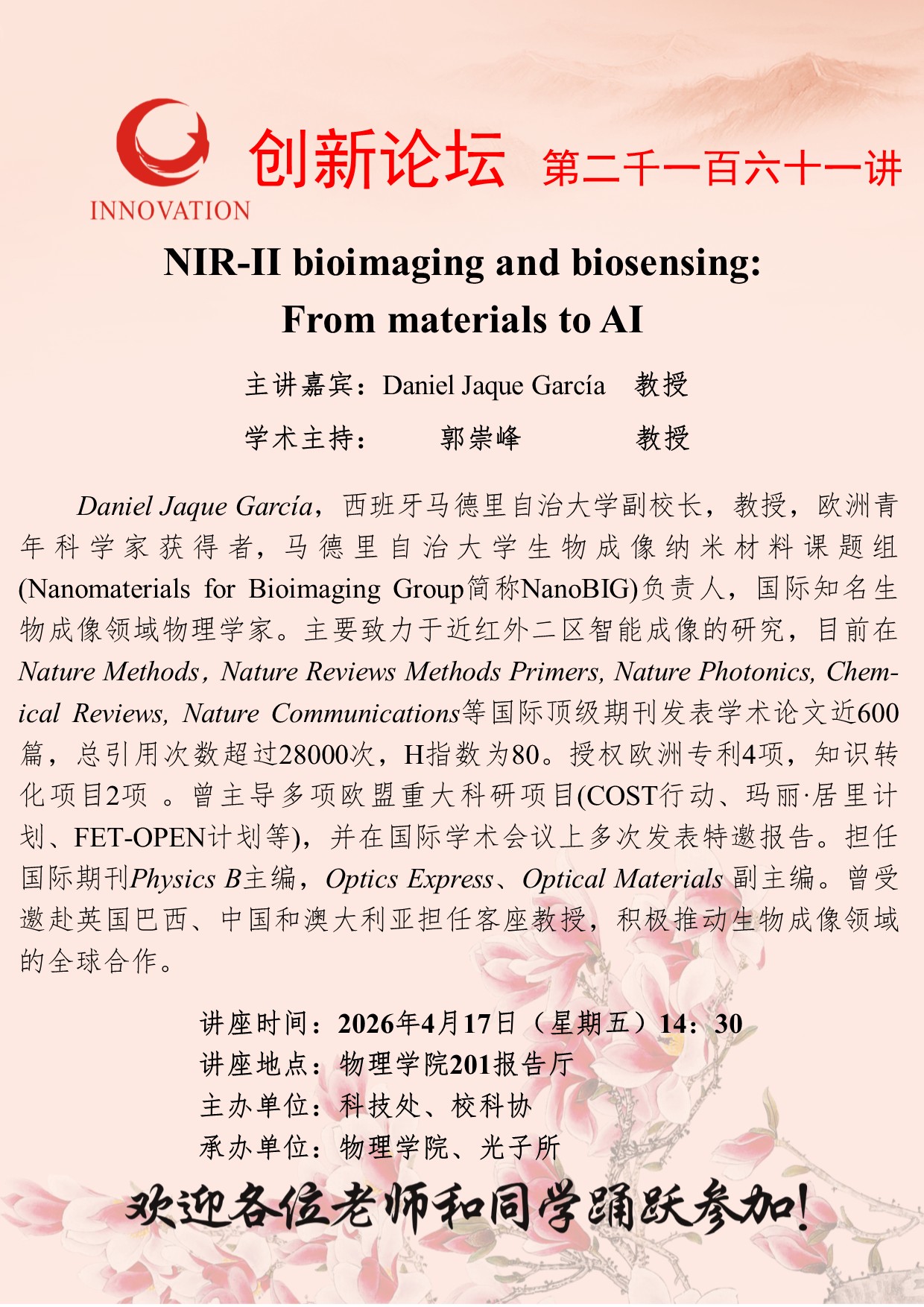 当前位置: 网站首页 > 讲座预告 > 正文 西北大学创新论坛第二千一百六十一讲:NIR-II bioimaging and biosensing: From materials to AI 浏览量:时间:2026-04-16