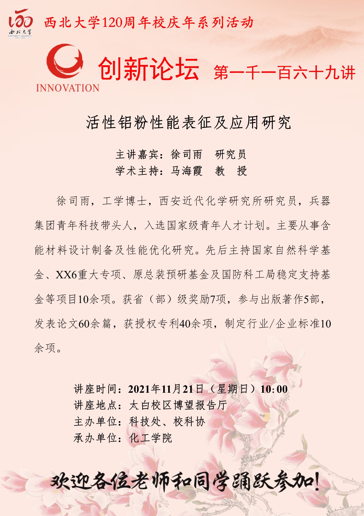 西北大学创新论坛第一千一百六十九讲暨120周年校庆年系列活动:活性铝粉性能表征及应用研究